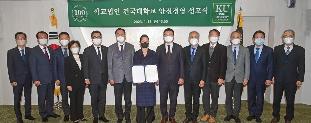 학교법인 건국대학교가 13일 개최한 안전경영 선포식에서 유자은 이사장(가운데)과 산하기관장들이 기념촬영을 했다. |