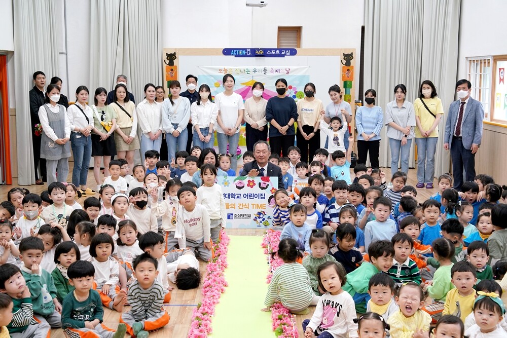 민영돈 조선대 총장이 어린이날을 하루 앞둔 4일 조선대 어린이집을 찾아 어린이들에게 간식을 전달한 뒤 함께 기쁨을 나누고 있다. 사진=조선대 제공 |