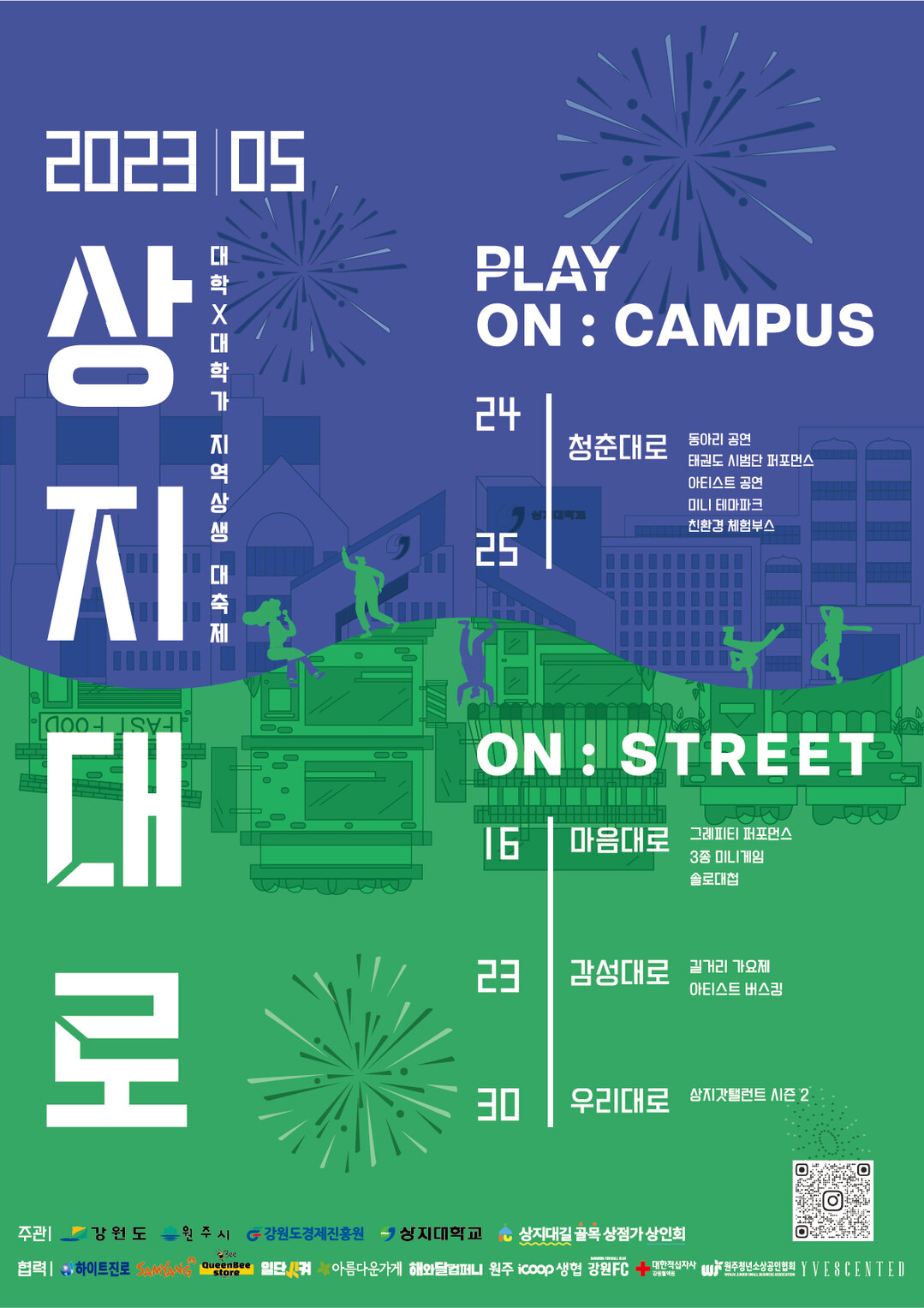 행사 기간 동안 상지대길 상점가에서는 1,300만 원 상당의 상품권을 배포하는 등 다양한 미니게임과 가요제, 아티스트 공연(케이시), 포차 거리가 운영되며, 상지대학교 내 행사에서는 동아리 공연, 학생들의 문화체험 부스, 친환경 체험 부스, 아티스트 공연(로꼬, 우원재, H1-KEY, 자이언티, 이하이)이 펼쳐진다.