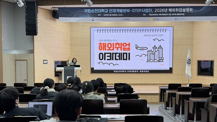 [대학저널 온종림 기자] 국립순천대학교 지역특화청년무역전문가양성사업단(GTEP사업단)이 지난 2월 26일 학내 사회과학관 200호실에서 2026년 인재개발본부-GTEP 해외취업 설명회를 개최했다.