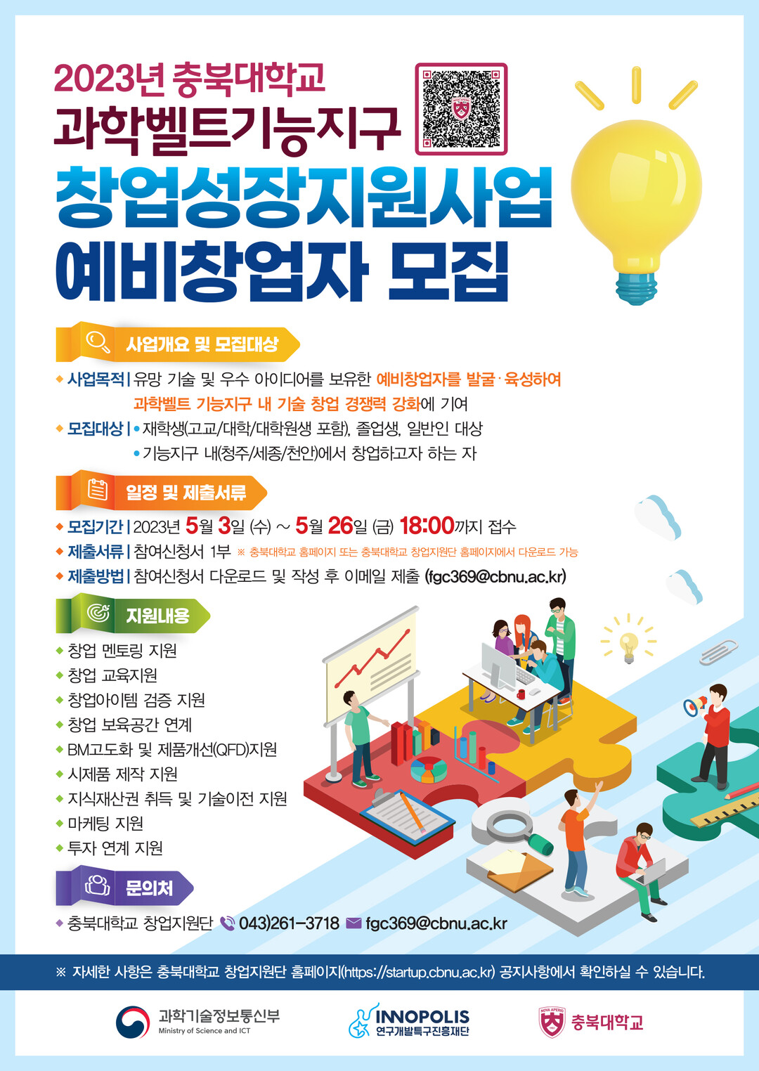 신청을 원하는 예비창업자는 충북대 홈페이지 또는 충북대 창업지원단 홈페이지를 통해 신청할 수 있다. 자세한 사항은 충북대 창업지원단으로 문의하면 된다.