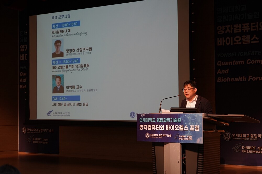 연세대 융합과학기술원이 21일 ‘제4회 양자컴퓨터와 바이오헬스 포럼’을 개최했다. 사진은 연사를 소개하는 연세대 정형일 K-NIBRT 교학부단장. |