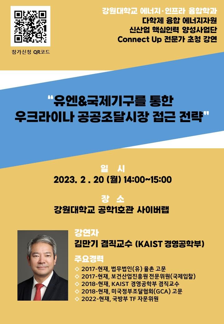 이번 강연에서 김만기 교수는 ‘유엔&국제기구를 통한 우크라이나 공공조달시장 접근 전략’을 주제로, 공공조달 개념소개와 더불어 유엔 및 유럽연합 등 국제기구를 통한 우크라이나 전후복구사업 참여 전략에 대해 소개할 예정이다.