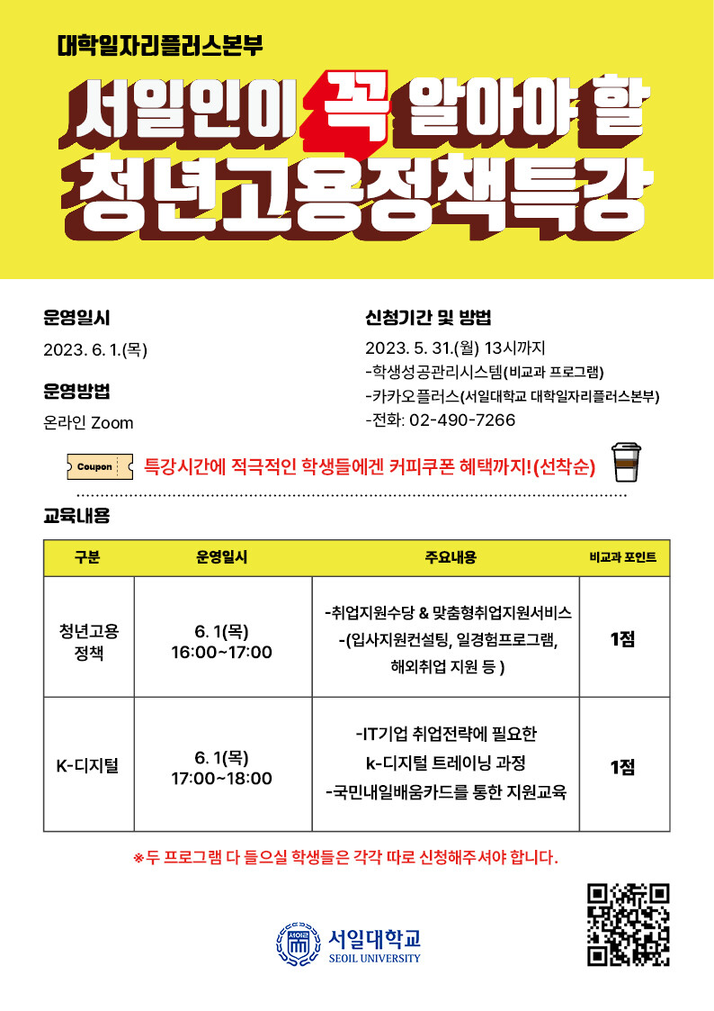 ‘서일인이 꼭 알아야 할 청년고용정책특강’ 주요 내용은 청년내일채움공제 정책, 국민취업지원제도 서비스, K-디지털 직업훈련 안내로, 학생들이 필요로 하는 정보를 중심으로 제공했다.
