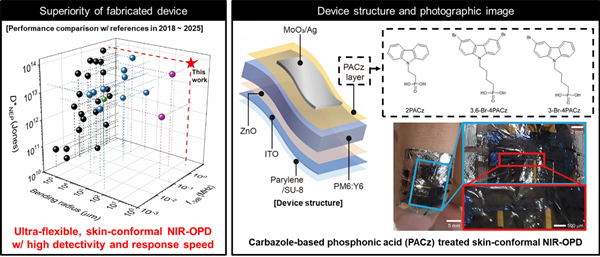 근적외선 유기 광검출기(NIR-OPD)는 보이지 않는 근적외선 신호를 전기 신호로 변환하는 기술로, 웨어러블 헬스케어, 피부 부착형 기기, 무선 광통신, 휴먼–머신 인터페이스 등 다양한 분야에서 핵심 요소로 주목받고 있다. 유기 반도체는 가볍고 유연해 인체 친화적이며, 유기 소자의 분자 구조를 조절해 감도·속도·파장 특성을 자유롭게 설계할 수 있다는 장점이 있다.
