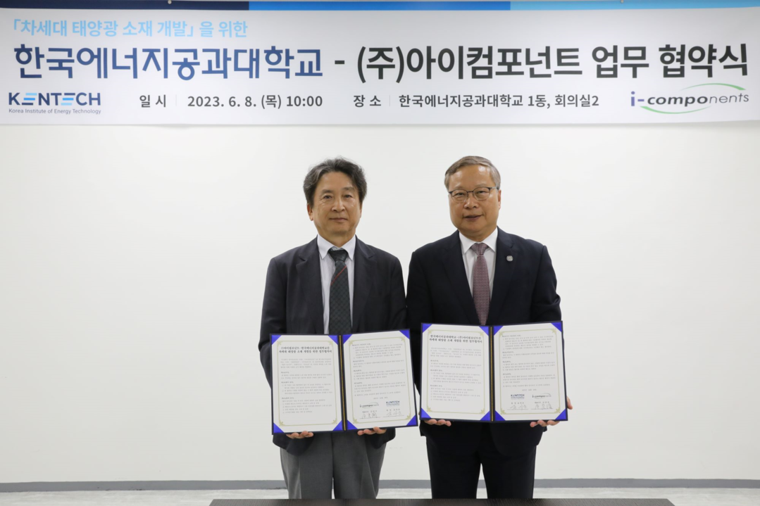 [대학저널 온종림 기자] 한국에너지공과대학교(켄텍)와 ㈜아이컴포넌트가 8일 차세대 태양광 소재 개발과 양 기관 간 협력체계 구축을 위한 업무협약을 체결했다.