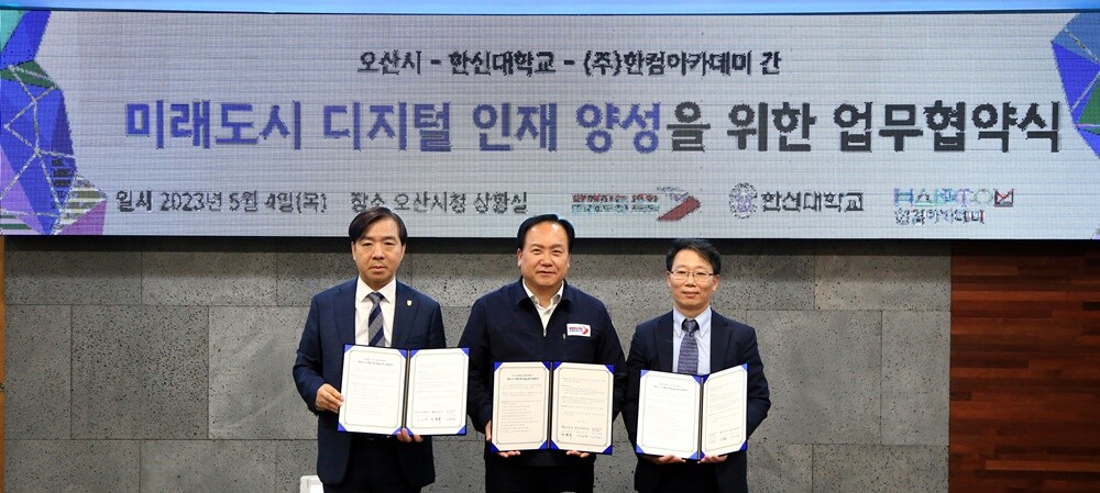 [대학저널 온종림 기자] 한신대학교와 오산시, ㈜한컴아카데미가 4일 오산시청 상황실에서 ‘미래 도시 디지털 인재 양성을 위한 업무협약’을 체결했다.