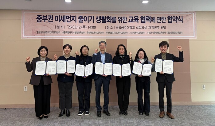 [대학저널 온종림 기자] 국립공주대학교 중부권미세먼지연구관리센터가 환경교육 사업의 일환으로 미세먼지 줄이기 생활화 교육 활성화를 위해 중부권 광역 및 지역환경교육센터 6개 기관과 12일 대학본부 8층 소회의실에서 업무협약(MOU)을 체결했다.