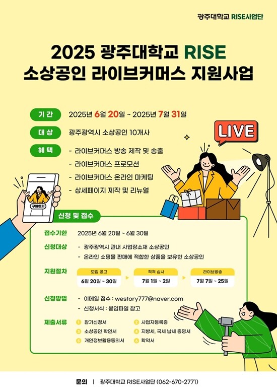 [대학저널 온종림 기자] 광주대학교 RISE사업단은 지역 경제 활성화 및 소상공인 자생력 강화를 목표로 2025 광주대학교 RISE 소상공인 라이브커머스 지원사업을 운영한다.