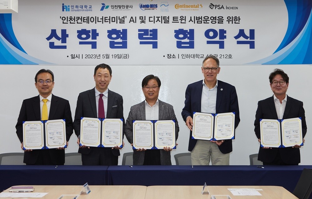 인하대 인공지능융합연구센터와 인천항만공사는 인천항 내 AI·디지털 트윈, 안전관리 설루션 등 디지털 신기술을 도입하기 위해 해당 분야 선도기업인 (주)오토메스텔스타, (주)콘티넨탈오토모티브코리아, ㈜인천컨테이너터미널과 업무협약을 체결했다.