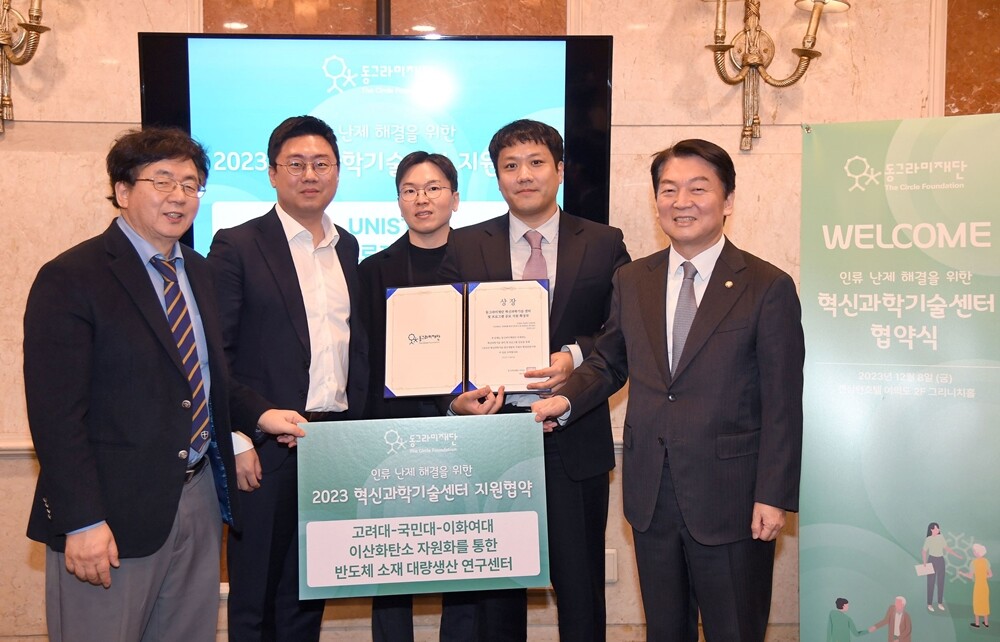 이화여대가 고려대·국민대와 함께하는 온실가스 배출이 전혀 없는 반도체소재 대량생산 기술 연구가 동그라미재단(구 안철수재단)의 지원을 받는다. 왼쪽부터 동그라미재단 이사장 장순흥, 이화여대 나종걸 교수, 국민대 이찬우 교수, 고려대 진경석 교수, 안철수 출연자. 사진=이화여대 제공 |
