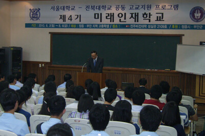 ‘미래인재학교’는 전북대와 서울대 소속 교수들과 사회 각계 전문가 등이 강사진으로 참가한 가운데 2일 개학식을 시작으로 6일 수료식까지 4박 5일 동안 정읍․부안지역 12개 고교생 100명을 대상으로 진행됐다. 이 기간 동안 인문․사회․과학 등 다양한 분야의 강의와 체험학습이 이뤄져 학생들에게 좋은 반응을 얻었다.