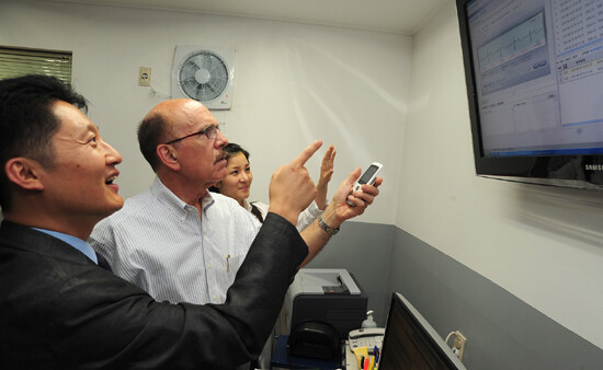 ▲ 18일 오후 건국대병원 U-헬스케어 관제센터에서 노벨 생리의학상 수상자(1998년)이자 건국대 초빙 석학교수인 루이스 이그나로 미국 UCLA대 교수가 휴대폰과 스마트폰을 통해 환자의 심전도를 실시간 전송하고 이를 이용해 심장환자를 원격 진료하는 U-헬스케어(U-Healthcare)시스템을 살펴보고 있다.<사진 건국대 제공>