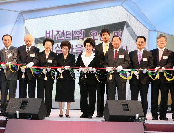 국내 최대 규모 지하캠퍼스 경원대 '비전타워' 준공 경원대가 국내 최대 규모의 지하캠퍼스를 구축했다. 경원대는 이날 가천의과대와의 통합을 공식 선언했다. 사진은 준공식 테이프 커팅 장면. 사진 왼쪽부터 이해찬 전 국무총리, 이현재 전 국무총리, 한명숙 전 국무총리, 이희호 전 대통령 영부인, 이길여 경원대 총장, 김남수 경원대 총학생회장, 김원기 전 국회의장, 박지원 민주당 원내대표, 이재명 성남시장.