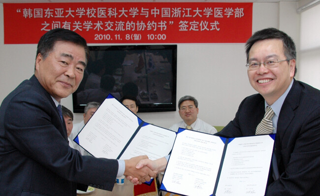 "손 잡은 동아대와 중국 절강대" 동아대 의과대학과 중국 절강대 의과학원이 학술교류협정을 맺었다. 협정식은 지난 8일 오전 11시 동아대 구덕캠퍼스 동아 의학시뮬레이션센터에서 진행됐다. 양 대학은 이번 협정을 통해 활발한 교류에 나설 예정이다. 사진은 노세현 동아대 의과대학장(좌측)과 루오 지앤홍 절강대 의과학원장이 협정서를 교환하고 있는 모습.