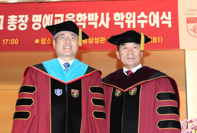 "고려대 명예박사된 연세대 총장" 김한중 연세대 총장(사진 좌측)이 고려대 명예박사가 됐다. 고려대(총장 이기수)는 지난 18일 고려대 백주년기념삼성관 국제원격회의실에서 김한중 연세대 총장에게 명예 교육학박사학위를 수여했다. 김 총장은 교육자로서 의료보건 분야 교육과 연구에서 커다란 업적을 남기고 전문지식을 바탕으로 정부 정책 수립에도 기여한 공로를 인정받았다.
