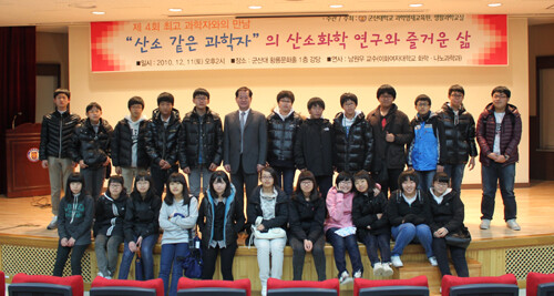 군산대(총장 채정룡) 과학영재교육원과 생활과학교실은 지난 11일 오후 교내 황룡문화홀 1층 강당에서 이화여대 남원우 석좌교수를 초청해 '4회 최고 과학자와의 만남'행사를 개최했다.