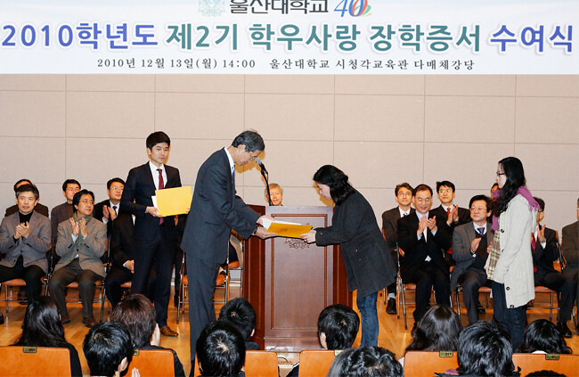 학우사랑 등록금 제도는 울산대가 2년 연속 등록금을 동결하자 가정형편이 어려운 학생들에게 희망을 주자는 취지에서 시행된 제도다. 지난 1학기에 이어 2학기에도 학생 2038명이 자발적으로 등록금에 5만 원 씩을 더 내 1억190만 원이 모금됐고 교직원들 동참, 총 1억2440만7000원이 모금됐다. 지난 1학기의 경우 2647명의 학생과 239명의 교직원이 모금에 참여해 총 2억7000만 원이 모금됐으며 101명의 학생들에게 장학증서가 전달됐다.