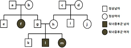 (다) 텔로미어 복원 이상으로 생겨나는 질병들도 있다. 워너증후군은 청소년기에 주름의 생성, 머리의 탈색, 대머리, 백내장, 근육 위축 등과 같은 노화 증상을 유발하는 유전병이다. 워너증후군 환자들은 텔로머라제를 도와서 텔로미어의 효율적인 복원을 가능케 하는 RecQ라는 효소가 결핍되어 있다. 따라서 워너증후군 환자들의 세포에서는 텔로미어가 일찍 짧아지게 된다. 일반적으로 유전병의 유전양식은 상염색체성 우성, 상염색체성 열성, 성염색체성 우성, 성염색체성 열성 등으로 나누어진다. 이러한 유전양식은 가계도 분석을 통해 판별할 수 있다.