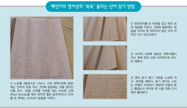혜인이의 첫 번째는 노하우는 ‘효과적인 단어암기’다. 단어를 무조건 쓰며 외우지 않는다. “영어의 가장 기본이 되는 단어는 두 세 번 소리내서 읽으며 발음을 외워요. 발음을 먼저 외우고 그 이후에는 그 발음을 기억하며 노트에 정리하면 더욱 오래 기억에 남거든요.” 이런 방식을 반복하면 30분 정도에 50~70개의 단어를 외울 수 있다. 그러나 단순히 단어만 외운다고 성적이 오르는 것은 아니다.