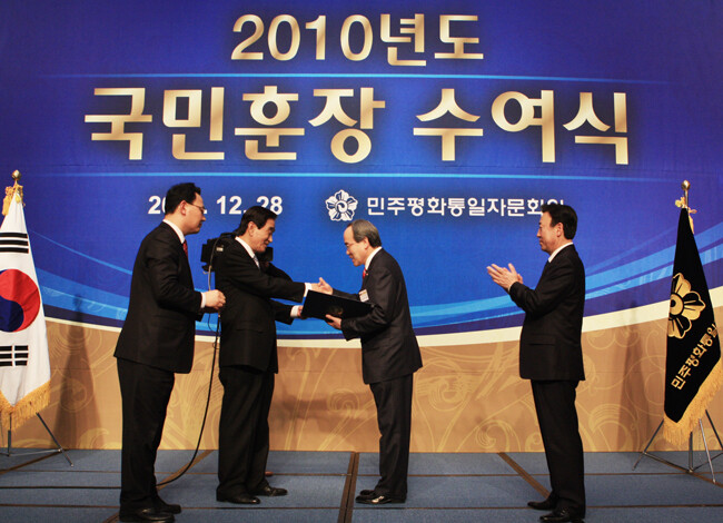 서거석 전북대 총장이 28일 오전 서울그랜드힐튼호텔에서 열린 민주평화통일자문회의 2010 국민훈장 수여식에서 이기택 부의장으로부터 국민훈장 목련장을 수상했다.