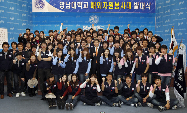 이를 위해 영남대는 30일 교내 법학전문도서관 대강당에서 제20기 해외자원봉사단 발대식을 가졌다. 재학생 89명으로 구성된 봉사단은 내년 1월 초부터 태국, 인도네시아, 라오스, 베트남, 방글라데시, 케냐, 인도, 멕시코 등으로 파견된다.