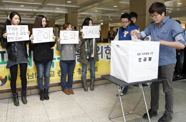 )에 '일본 대지진 쓰나미 긴급 구호 성금 모금' 안내 공지를 통해 모금 참여를 호소하는 한편, 총학생회 차원에서 성금모금함을 중앙도서관과 종합복지센터 등 학내 주요 장소에 설치해 성금모금 운동을 벌이고 있다. 또 이효수 영남대 총장 명의의 서신을 일본내 31개 자매대학 총장에게 보내 심심한 위로의 말과 피해복구를 위한 정신적·물질적 지원에 최선을 다하겠다는 의사를 전달했다. 사진은 학내에 설치된 성금 모금함 앞에서 일본에서 온 교환학생들이 모금 동참을 호소하고 있는 모습.