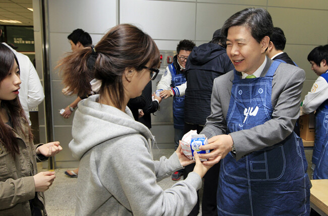 18일 아침 7시 반, 영남대 중앙도서관 지하 1층 로비. “A+ 간식과 행운기 팍팍 드립니다. 간식 드시고 시험 대박 나세요.”라는 외침이 들리자 어느새 학생들의 줄이 길게 이어졌다. 중간고사 준비로 새벽같이 등교한 학생들을 위해 이효수 영남대 총장이 직접 아침식사 배달에 나선 것.