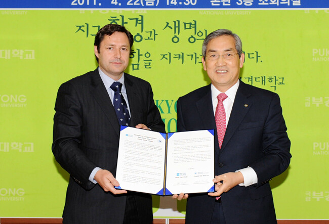 부경대 박맹언 총장과 주한영국문화원 롤란드 데이비스 원장은 지난 22일 부경대 대학본부 3층 회의실에서 영어교육사업 협력을 위한 양해각서를 체결했다. 부산에서 영국문화원과 영어교사 연수 프로그램을 개설하는 것은 부경대가 처음이다.