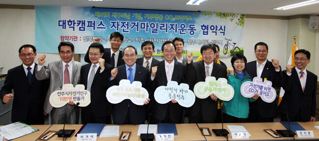 전북대(총장 서거석)가 에코캠퍼스 조성, 이산화탄소 배출량 감소를 위해 적극 나선다. 전북대는 '2011년 에코캠퍼스 조성'의 일환으로 '자전거 마일리지 운동'을 전개키로 하고 25일 한지산업지원센터에서 전주시와 전주시의회, 전주시자전거생활협의회, 전주대 등과 협약을 체결했다. 이에 앞서 전북대는 행정안전부의 자전거 이용 활성화 사업 시범기관에 선정돼 이산화탄소 배출 감소에 앞장서고 있다.