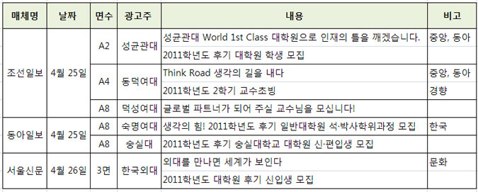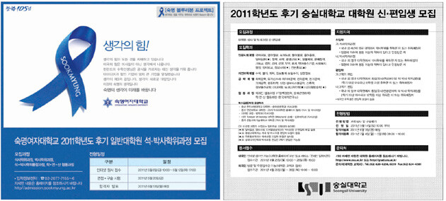 4월 마지막 주 대학광고는 대학원생 및 교수 초빙 광고가 주류를 이뤘다. 성균관대, 숙명여대, 숭실대, 한국외대 등은 대학원생 모집 광고를 선보였다.