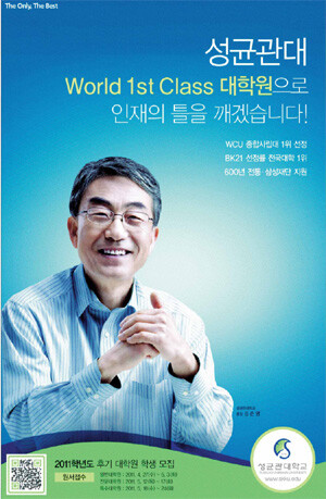 특히 성균관대는 김준영 총장을 메인 이미지로 선보이며 "성균관대 World 1st Class 대학원으로 인재의 틀을 깨겠습니다!"라는 후기 대학원 학생 모집에 박차를 가했다.