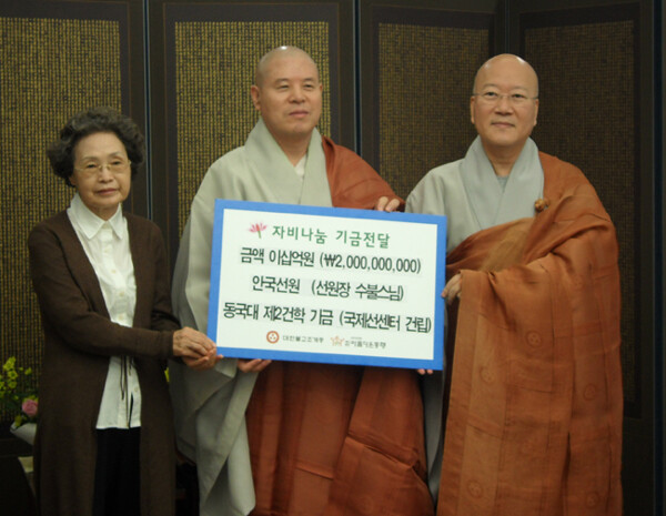 안국선원 수불스님은 앞서 2주 전인 지난 6일에도 동국대 제2건학기금 5억 2천만원을 전달한 바 있다.