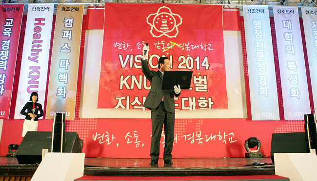 이날 선포된 비전은 'VISION 2014 KNU 글로벌 지식선도대학'으로 경북대가 올해부터 오는 2014년까지 달성해야 할 분야별 중·단기 발전계획이다.