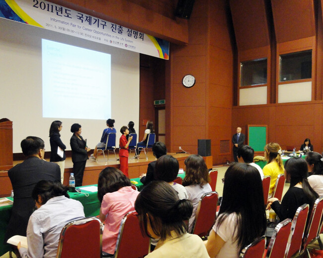 전북대(총장 서거석)가 국제기구 진출을 준비하고 있는 학생들과 일반인들을 위해 유익한 시간을 마련, 눈길을 끌었다. 전북대는 30일 유엔사무국, 유엔산업개발기구, 국제노동기구 등 주요 국제기구 인사담당자를 초청해 '국제기구 진출 설명회'를 개최했다. 설명회에는 유엔사무국 Martha Helena Lopez 인사국장을 비롯해 John Ericson 인사과장, 유엔산업개발기구 Okusitina Bulavakaru 인사과장, 국제노동기구 Sylvia Mesa 인사과장, 외교통상부 이경철 과장 등이 참석했다. 이들은 국제기구별 주요 업무와 직원 채용·자격요건·절차, 영문이력서 작성법, 채용면접 준비 등 그동안 생소했던 국제기구 취업에 대한 전반적인 내용을 소개해 참석자들로부터 호응을 얻었다.