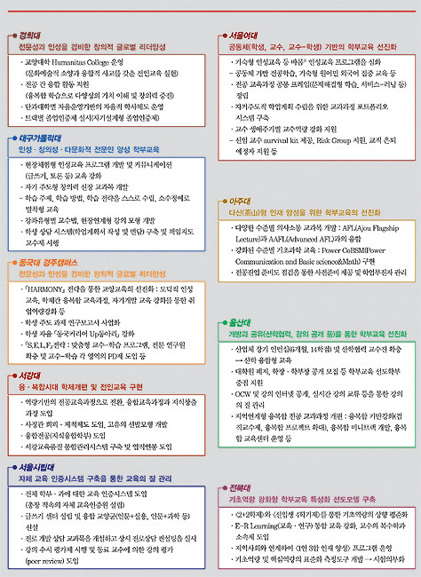 경희대는 전문성과 인성을 겸비한 창의적 글로벌 리더를 양성한다. 이를 위해 교양대학으로 후마니타스 칼리지(Humanitas College)를 운영하고 전공 간 융합 활동을 지원한다. 동국대 경주캠퍼스는 창의적 글로벌 인재 양성을 위한 핵심역량 선진화 모델을 구축한다. 자기개발 교육 강화를 통한 취업역량강화, 맞춤형 교수-학습 프로그램 운영 등이 대표적인 사업. 서강대는 ‘융·복합시대 학제개편 및 전인 교육 구현’으로 ACE에 선정됐다. 이에 따라 융합전공(지식융합학부)을 도입하고 서강교육 품질 통합관리시스템을 구축한다.