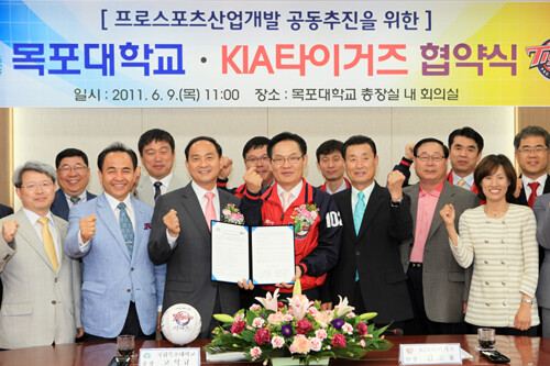 목포대(총장 고석규)와 KIA타이거즈가 9일 목포대 총장실에서 '프로스포츠산업개발 공동추진을 위한 산·학 업무협력 협약'을 체결했다.