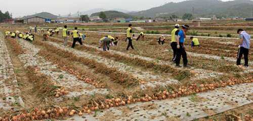 목포대 교직원자원봉사단은 9일 전남 무안군 청계면 송현2리 부락내 농가에서 교직원 50여 명이 참여한 가운데 양파수확작업을 도왔다.