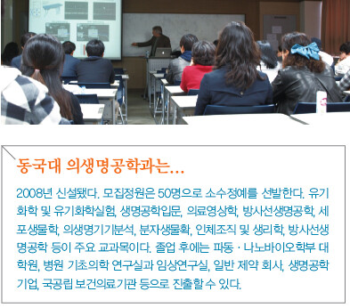 또한 동국대 의생명공학과는 동국대 일산병원, 루트로닉, 지멘스, 매드트로닉코리아, 라이프리버, 바이오랜드코리아 등에 학생들을 파견해 실무능력을 갖추도록 하고 있다. 명품 교수, 명품 교육 못지않게 학생들의 실력도 우수하다. 동국대 의생명공학과는 2011학년도 정시 모집 수능성적에서 자연계열 기준으로 생명과학과와 함께 최상위권을 기록했다. 권영은 교수는 “사회적 트렌드를 많이 타는 측면이 있고 관련 산업 발달, 우수한 연구 수주 능력 등이 우수 신입생 유치에 영향을 미치는 것으로 본다”고 말했다.