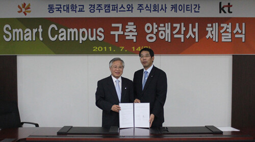 동국대 경주캠퍼스는 (주)KT와 14일 교내 백주년기념관에서 'Smart Campus 구축 협력을 위한 양해각서'를 체결했다.