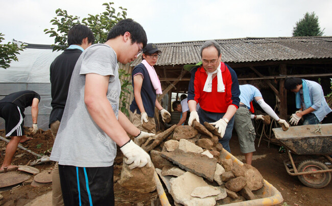 전북대(총장 서거석)는 16일 수해를 입은 정읍 지역을 찾아 수해 복구 봉사활동을 실시했다. 이날 봉사활동에는 서거석 총장을 비롯해 본부 보직자들과 교직원, 학생 등 모두 120여 명이 참여했다. 봉사단은 흙탕물로 가득찬 마을의 수로를 정비하고 집집마다 방문, 무너진 담벼락을 정돈했다. 특히 학생들은 독거노인들이 살고 있는 가정을 찾아 집 안팎의 일손을 거들었다. 또한 전북대는 봉사활동과 함께 구호품으로 쌀 100포대를 전달했으며 수해 지역 학생들에게는 '재해 장학금'을 지급하기로 해 지역 거점대학으로서 책무를 다한다는 방침이다. 서거석 총장은 "지역 거점 대학으로 지역에 대한 책임과 역할을 다하고자 학생과 교직원, 보직 교수들이 대거 참여하는 봉사활동을 계획하게 됐다"며 "이번 봉사활동을 통해 수해로 신음하는 지역민들에게 조금이나마 힘이 되길 바란다"고 말했다.