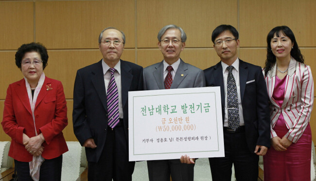 주인공은 전남대 이돈주 명예교수(국어국문학과)의 사위인 정용호 광주 튼튼정형외과 원장. 정 원장은 7일 장인인 이 명예교수와 함께 김윤수 전남대 총장을 찾아 장학금 5000만 원을 기탁했다. 전남대는 기부받은 장학금을 '성재 이돈주 국어학연구 장학금'으로 명명하고 국어국문학과 대학원생들을 대상으로 매년 500만 원씩 10년간 지급할 예정이다.