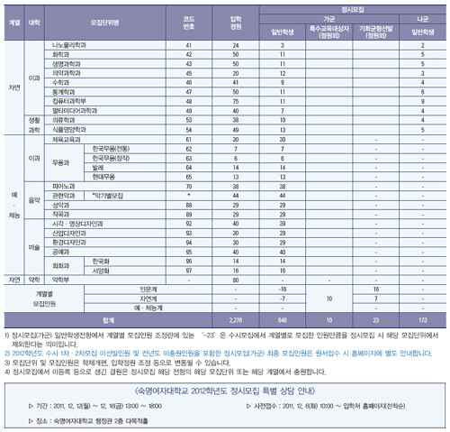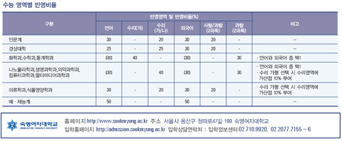 숙명여대는 일반학생전형의 가군 우선선발과 나군 모두 수능 100%를 반영해 선발하는데 수능성적은 영역별 백분위를 적용한다. 인문계는 언어, 수리, 외국어, 탐구 4개 영역을 반영하고 자연계는 언어와 외국어 중 백분위가 높은 영역을 선택해 총 3개 영역을 반영한다.