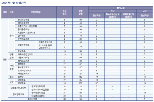 정시 가군 일반학생전형은 총 648명을 선발하며 이중 인문계 및 자연계 모집인원의 50% 내외를 수능성적 100%로 우선 선발한다. 나머지 인원은 일반선발로 수능 60%, 학생부 40%로 선발하며 예체능계열은 실기전형을 포함한다. 정시 나군 일반학생전형은 수능 100%로 총 173명을 선발한다.