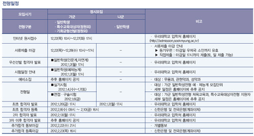 정시모집 일반학생전형의 가군 우선선발자 및 나군 합격자는 2012년 1월 2일(월)에, 나머지 전형은 2012년 1월 20일(금)에 각각 발표한다.