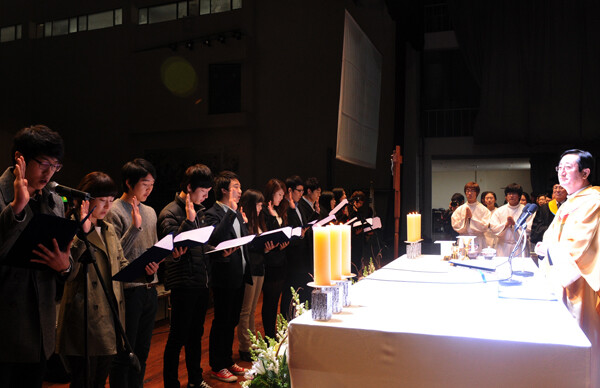 대구가톨릭대(총장 소병욱)는 지난 2월 29일 하양 효성캠퍼스 전이냐시오관에서 학생, 학부모, 대학 관계자 등 4000여 명이 참석한 가운데 '2012학년도 신입생 입학식 및 입학미사'를 거행했다. 특히 대구가톨릭대는 정부로부터 '잘 가르치는 대학'으로 공인받은 바 있어 신입생들의 희망찬 대학생활을 예고했다. 사진은 신입생 대표 학생들이 소병욱 총장에게 입학선서를 하고 있는 모습.