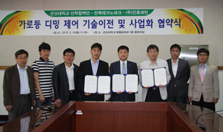 군산대(총장 채정룡)와 ㈜진흥패턴, (재)전북테크노파크는 10일 교내 황룡문화관 2층 중회의실에서 가로등 디밍 제어 기술이전 협약을 체결했다.