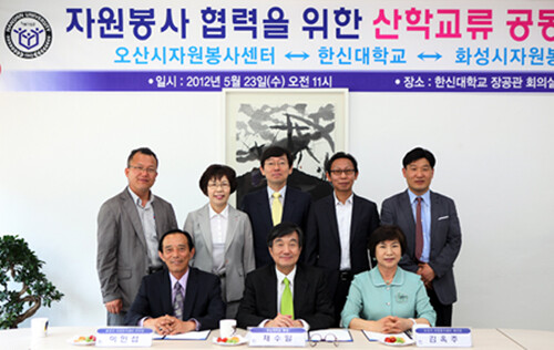 한신대는 “화성시자원봉사센터, 오산시자원봉사센터와 23일 오전 11시 한신대 장공관 회의실에서 자원봉사 협력을 위한 산학교류 공동 협약을 체결했다”고 밝혔다. 이날 협약식에는 채수일 총장을 비롯해 이인섭 화성시자원봉사센터 이사장, 김옥주 오산시자원봉사센터 센터장, 임병철 한신대 종합인력개발센터장 등 한신대와 화성시, 오산시 자원봉사센터 주요 관계자들이 참석했다.
