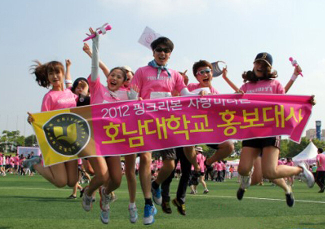 호남대(총장 서강석) 학생홍보대사들은 지난 10일 오전 광주 상무시민공원에서 열린 ‘핑크리본 사랑마라톤대회’에 참가해 유방암에 대한 예방의식 향상과 조기검진의 중요성을 알리는 홍보활동을 펼쳤다.