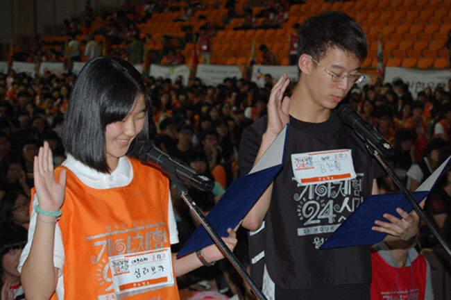 ‘2012 월드비전 기아체험 24시간 광주캠프’가 지난 27일 호남대 광산캠퍼스 문화체육관에서 개최됐다. ‘행복한 굶주림 1박 2일 - Hope For Children’이라는 주제로 진행된 이날 행사는 월드비전 광주전남지부가 주최하고 호남대와 광주광역시교육청, 무등일보 주관으로 열렸다. 이날 기아체험에 참가한 학생들은 전 세계 곳곳에서 굶주림으로 고통 받는 사람들의 어려움을 직접 체험하고 이를 통해 나눔과 봉사의 소중함을 느꼈다. 사진은 선서를 하고 있는 호남대 학생들.